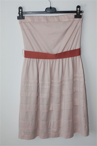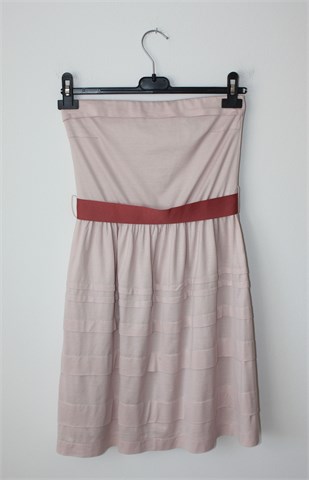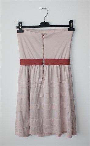 Mango Suit haljina bez naramenica nude-roze boje. Ukrasni remen u struku (zašiven), stražnji vidljivi cif. Donji dio ukrašen prošivima, cijela podstavljena. U gornji šav našivena je guma.