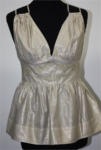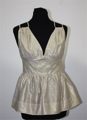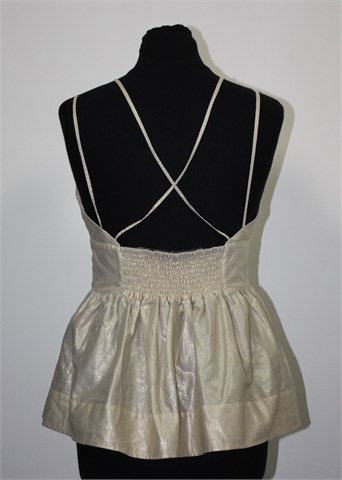 Mango Suit topić bež boje sa zlaćanim sjajem. Ispod prsiju aplikacije od zlatnog konca, leđa su otvorena a naramenice se križaju (vidljivo na slici). Na leđima rastezljive gumice pa je širina dosta prilagodljiva. Lagan i prozračan.