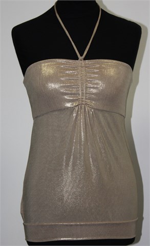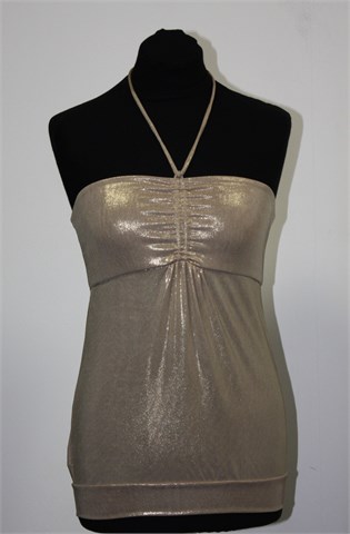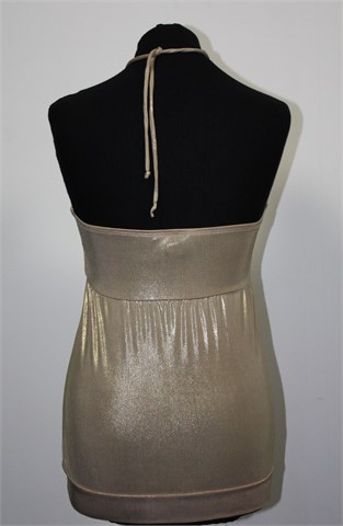 Mango Suit majica/topić zlatno-bež boje, sjajan materijal. Tube topić sa vezanjem oko vrata (vezice su dosta dugačke). Dio iznad grudi je dupli materijal. Lagana i vrlo rastezljiva.
