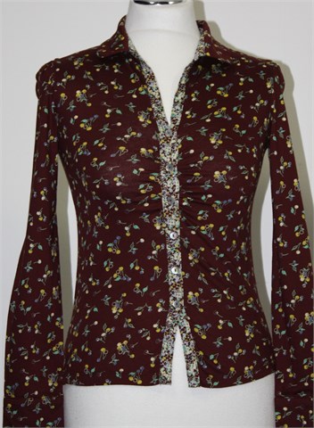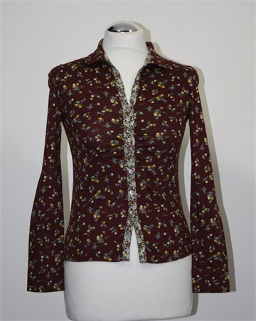 Mango majica-košulja tamno smeđe boje sa printom i detaljima od materijala sa cvjetnim uzorkom. Prednje kopčanje sa ukrasnim sedefastim gumbićima, kopčanje na krajevima rukava (po dva ukrasna gumbića). Kroj košulje a materijal je kao za t-shirt (mekani i rastezljiv pamuk). Mali bočni prorezi.