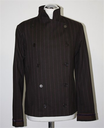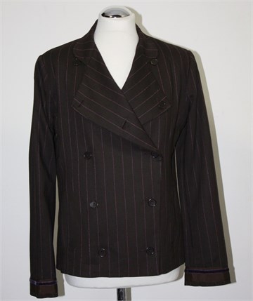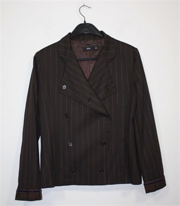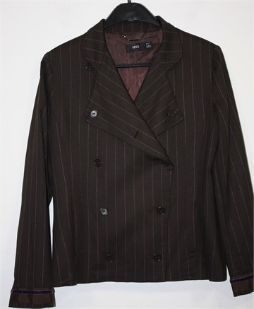 Mango sako/jakna tamnije smeđe boje sa lila prugama. Prednje kopčanje - dvije varijante kopčanja (obje vidljive na slikama), jastučići u ramenima. Bočni džepovi, ukrasne plišane trakice na rubovima rukava. Tanji štofasti materijal, podstavljen.