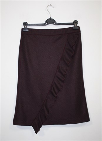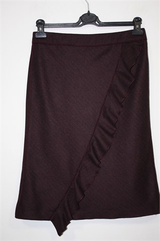 Mango suknja prošarano zagasito ljubičaste boje sa tamnijim ciklama rozim prugama. Sa prednje strane kosi volančić (vidljivo na slikama), stražnji cif. Podstavljena (ručno skraćivana, mjestimično rastegnuta na šavovima), odličan vunasti štof.