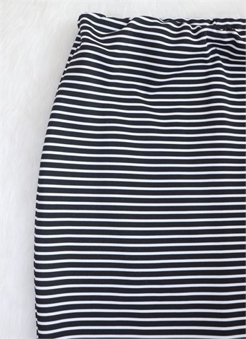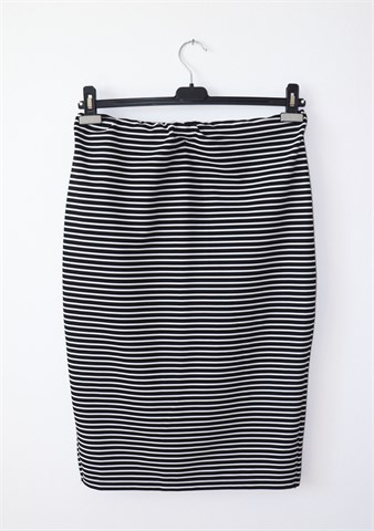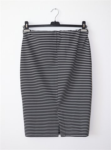Mango Casual prugasta suknja u kombinaciji crne i bijele boje. Gumica u struku, mali stražnji prorez. Čvrst i rastezljiv materijal.