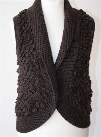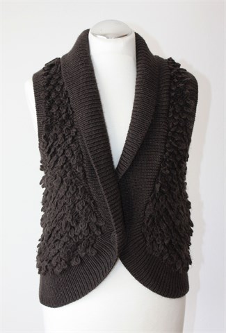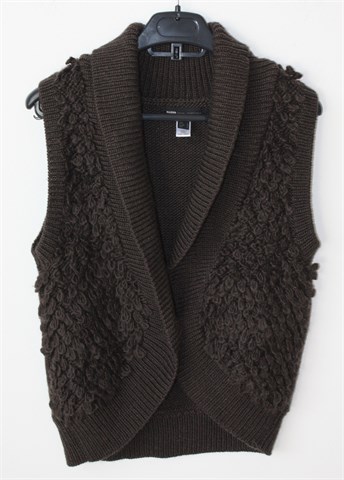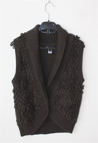 Mango casual sportswear vesta bez rukava, tamno smeđe boje. Prednje kopčanje sa jednim gumbom. Deblje pletivo, mucasto i rastezljivo.