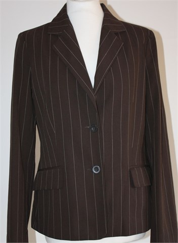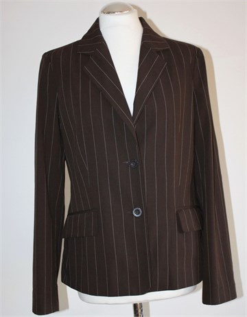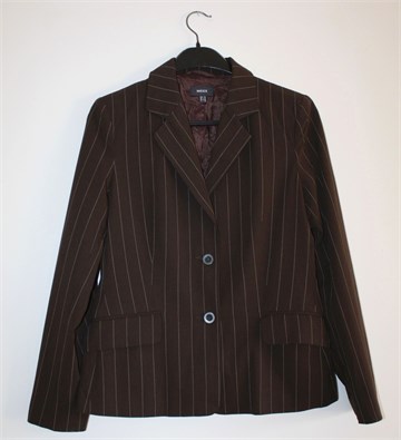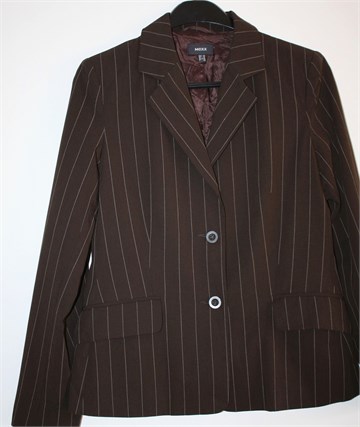 Mexx sako tamno smeđe boje sa bijelim prugama. Prednje kopčanje, bočni džepovi sa preklopom. Podstavljen, blago strukiran. Tanji štofasti materijal.