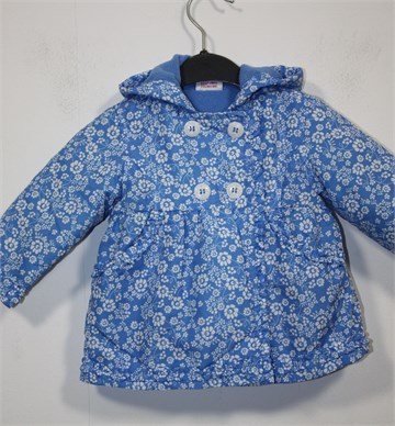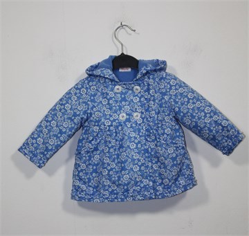 Mini Club jakna plave boje sa bijelim cvjetnim printom/uzorkom. Prednje kopčanje sa gumbima, bočni džepovi i kapuljača. Cijela podstavljena flisom plave boje. Odlična za prijelazna razdoblja.
