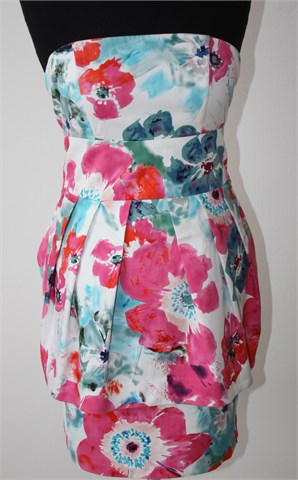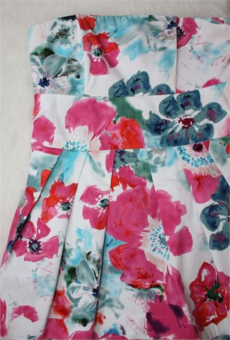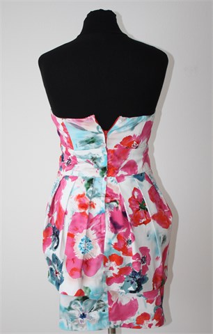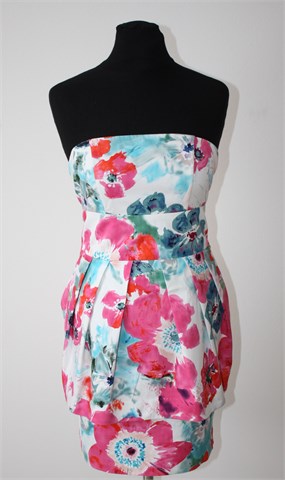 New Look haljina bijele boje sa šarenim printom (boje i uzorak printa vidljivi na slikama). Bez naramenica, uz gornji šav našivena je silikonska traka (da haljina ne klizi). Stražnji skriveni cif, blago rastezljiva. Podstavljena u gornjem dijelu.
