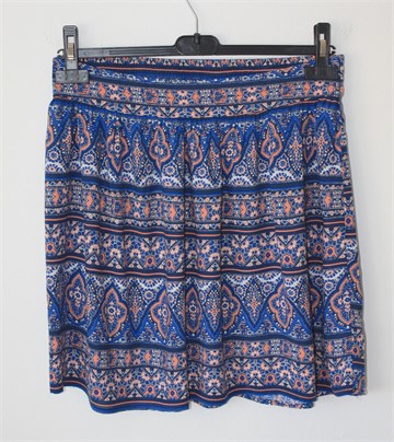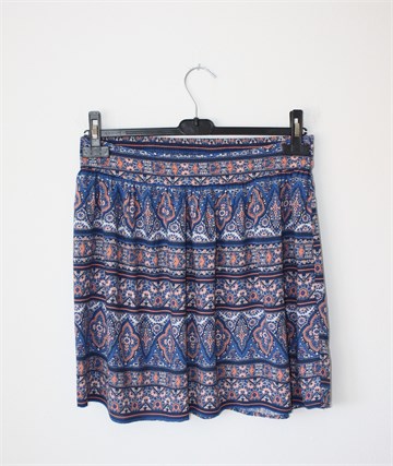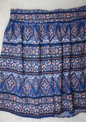 New Look suknja plave boje sa printom (boje i uzorak printa vidljivi na slikama). Stražnja strana pasice prošivena je sa gumicama (prilagodljiva širina - vidjeti mjere). Tanji i lagan materijal.
