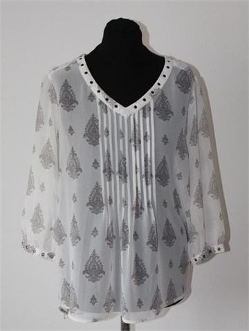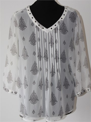 Next bluza sa poludugim rukavima, bijele boje sa printom (boje i uzorak printa vidljivi na slikama). Prednji ukrasni ušitci, oblo rezana na dnu (nešto duža sa stražnje strane - vidjeti mjere). Lagana i prozračna, providna.