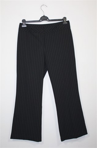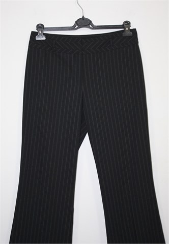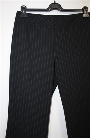 Next hlače klasičnog kroja, crne boje sa diskretnim crnim i bijelim prugastim uzorkom. Prednji cif i kopčanje, uska pasica za remen. Vrlo blago rastezljive. Porub je dosta širok pa bi se mogao odšiti i produžiti hlače za cca 3 cm.