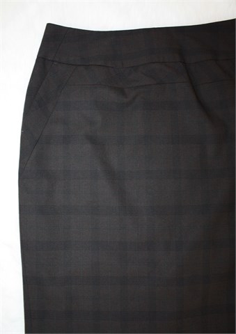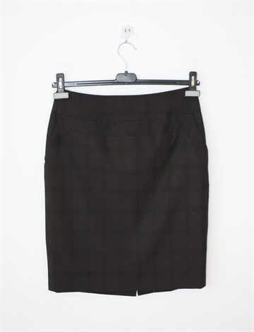 Next suknja tamno smeđe boje sa uzorkom na materijalu (vidljivo na slikama). Stražnji cif i kopčanje, prednji bočni džepovi. Podstavljena, mali stražnji rasporak.