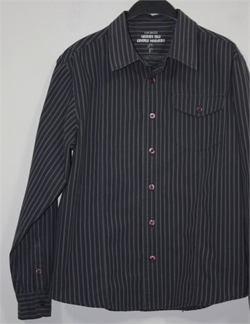 Okaidi košulja sa dugim rukavima, tamno sive boje sa prugama. Prednje klasično kopčanje, džepić na prsima. Čvrst i kvalitetan pamuk.