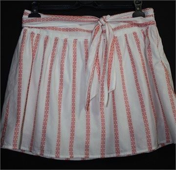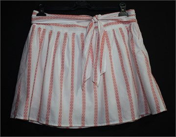 Old Navy pamučna suknja, bijele boje sa crveno-narnčastim uzorkom. Bočni cif, podstavljena pamučnom podstavom. U struku trakice za vezanje (zavezane sa prednje strane).