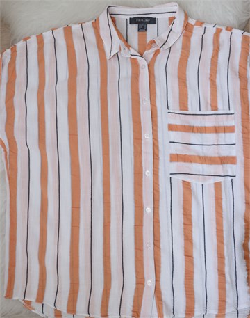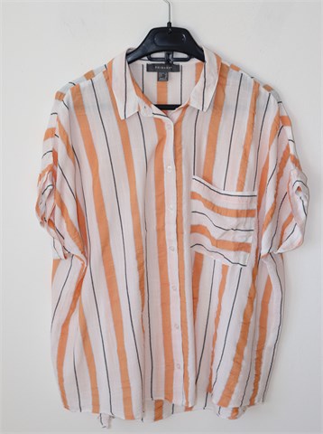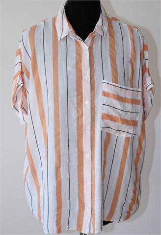 Primark košulja sa kratkim rukavićima, bijele boje sa prugastim uzorkom (boje vidljive na slikama). Džepić na prsima, lagana i blago providna. Nije rastezljiva, malo duža sa stražnje strane.