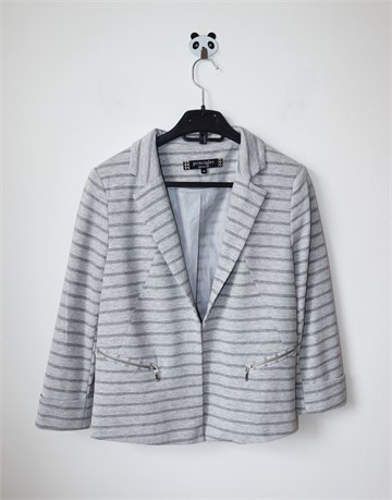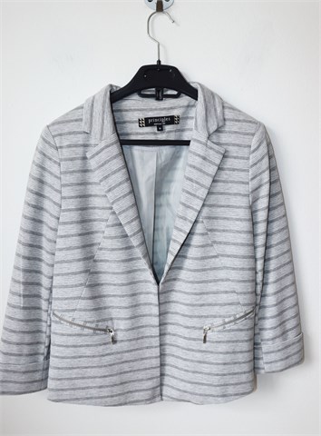Principles by Ben de Lisi sako/blazer/jakna sive boje sa prugastim uzorkom. Prednje kopčanje sa jednom kopčicom, jastučići u ramenima, podstava. Rastezljv materijal, poludugi rukavi.