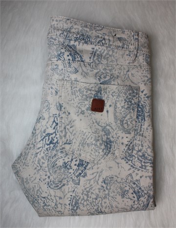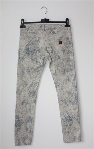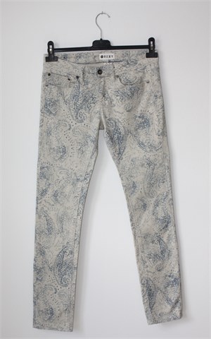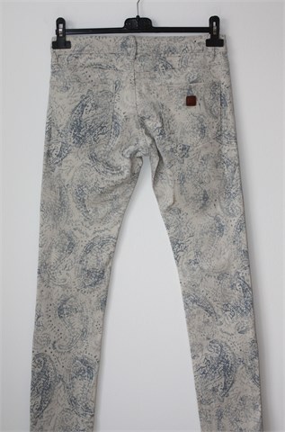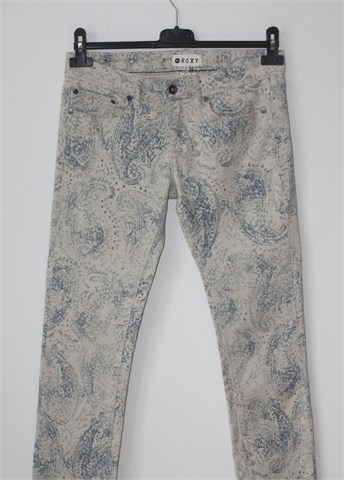 Roxy traper hlače sivo-bež boje sa plavim printom (uzorak printa vidljiv na slikama). Prednji cif i kopčanje, pasica za remen. Prednji i stražnji džepovi, rastezljive. Oznaka modela - skinny (uske nogavice).