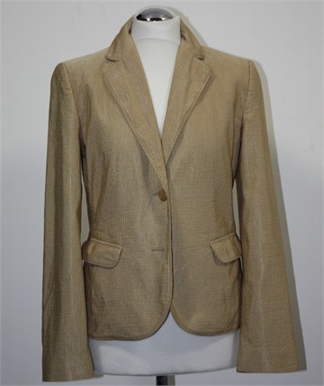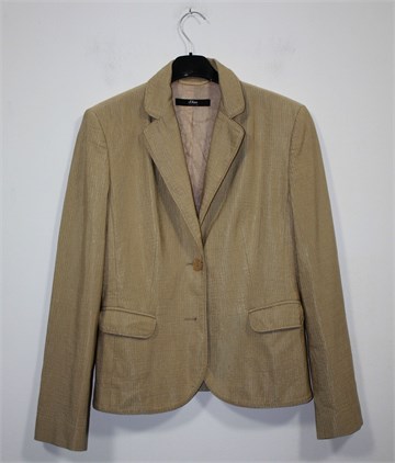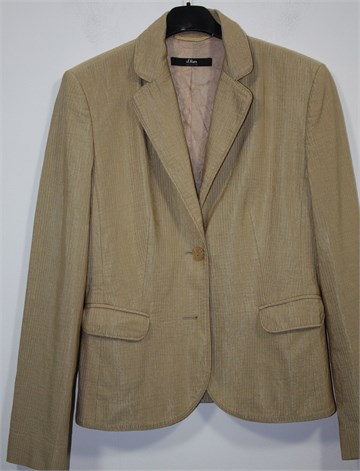 S. Oliver Selection sako bež boje, materijal je rebrasto prugast i blago sjajan. Prednje kopčanje (jedan gumb se odšio ali za etiketu je zašiven rezervni), bočni džepovi sa preklopom. Blagi jastučići u ramenima, podstavljen.
