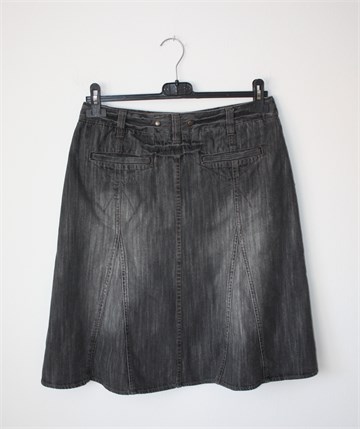Street One traper suknja sive boje, mjestimično isprani/used look. Prednji cif i kopčanje, pasica za remen. Prednji mali džepići, stražnji skriveni. Nije rastezljiva.