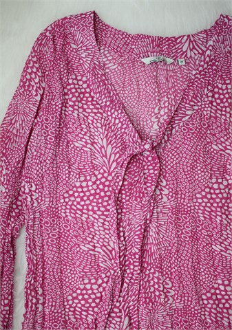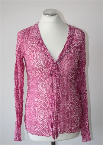 Tom Tailor bluza sa dugim rukavima, ciklama rozo-bijele boje sa uzorkom na materijalu (vidljivo na slikama). Sa prednje strane (iznad dekoltea) dvije trake koje se po želji mogu zavezati. Tanja i lagana, rastezljiva. Moguće blago providna, zgužvan materijal.