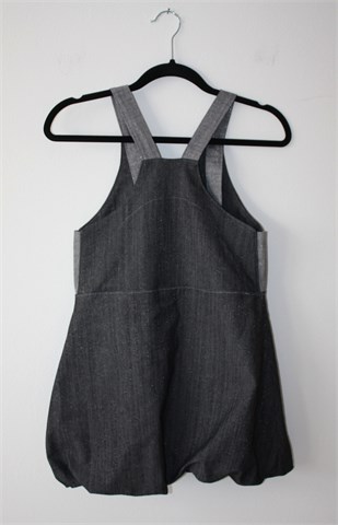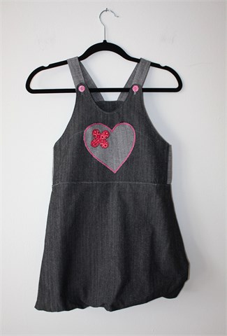 Šivana i unikatna traper haljina bez rukava, sivo-plave boje, materijal je blago sjajan. Našiveno srce-aplikacija sa prednje strane (ispod je džepić), naramenice na kopčanje sa ukrasnim gumbićem. Pufasti kroj, blago rastezljiva.