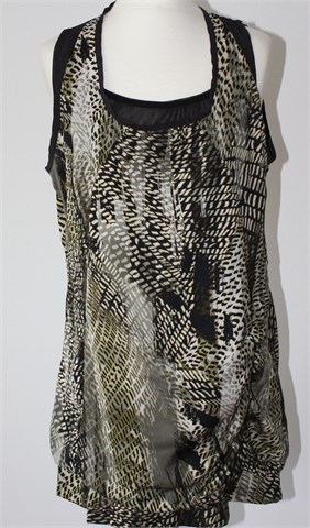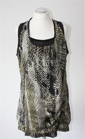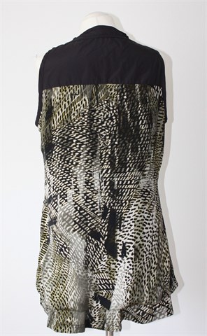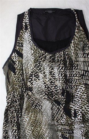 Warehouse tunika/bluza bez rukava sa šarenim printom (boje i uzorak printa vidljivi na slikama). Podstavljena mrežastom podstavom, pri dnu gumica, nabori i volančić. Lagana i prozračna, bočni cif. Nije rastezljiva (samo podstava).