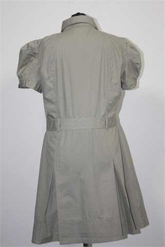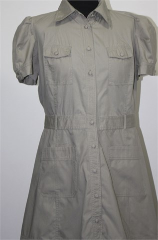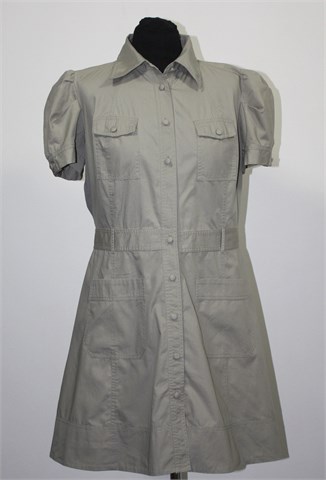 Warehouse haljina/tunika sa kratkim rukavima, sivo-bež boje (možda blago svijetlo maslinasta nijansa). Prednje kopčanje (jedan gumbić se odšio ali za etiketu je pričvršćen rezervni), džepići na prsima. Pasica za remen, prednji džepovi. Blagi puf rukavići sa ušitcima, blago strukirana. Tanji pamuk.