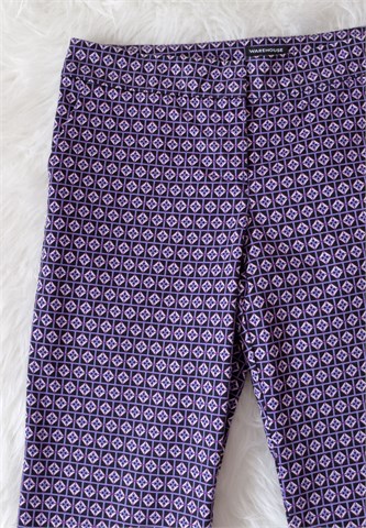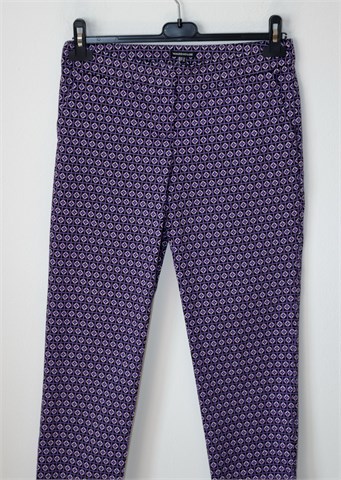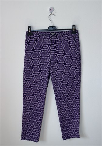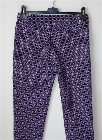 Warehouse hlače crne boje sa printom (boje i uzorak printa vidljivi na slikama). Prednji cif i kopčanje, mali rasporci sa stražnje strane ruba nogavice. Prednji bočni, stražnji ukrasni/lažni džepovi. Vrlo blago rastezljive. Dužina do cca gležnja (ali vidjeti mjere).