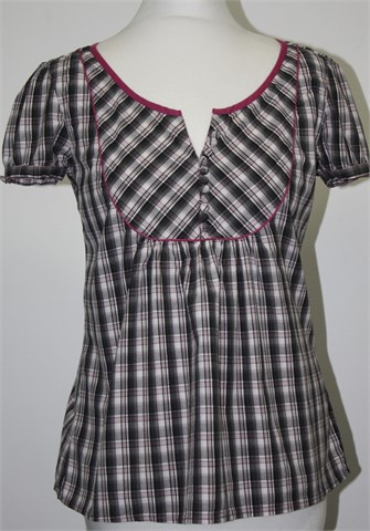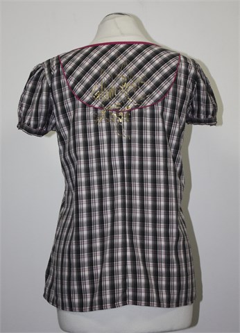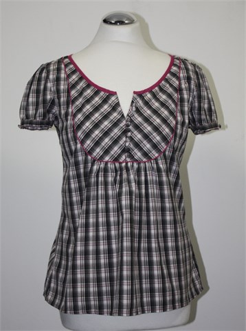 XX by Mexx bluza sa kratkim rukavima, prugasto-karirana kombinacija bijele, crne, sive i ciklama ljubičaste boje (uzorak kao na slikama). Prednje kopčanje, gumbić na svakom rukavu. Zlatni print na leđima (vidljivo na slici). Nije rastezljiva.