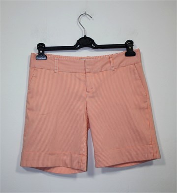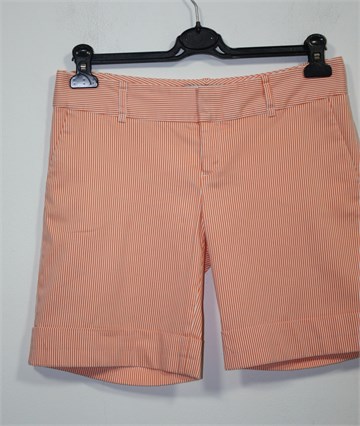 Zara kratke hlače/bermude, prugasta kombinacija bijele i narančaste boje. Prednji cif i kopčanje, pasica za remen. Prednji bočni, stražnji ukrasni džepovi. Blago rastezljive.