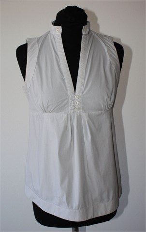 Zara bluza bez rukava, bijele boje sa svijetlo sivim prugama. Gumbići sa prednje strane, rezana ispod prsiju. Tanja, lagana i rastezljiva.