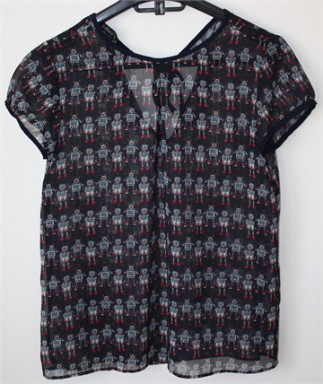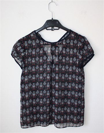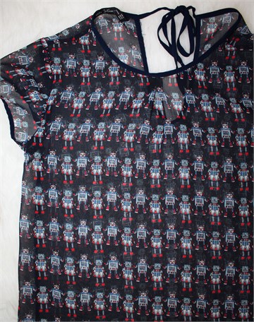 Zara Trafaluc bluza sa kratkim rukavima, tamno plave boje sa printom robota (boje i uzorak printa vidljivi na slikama). Na leđima otvor i vezanje, tanka i lagana. Providna, nije rastezljiva.
