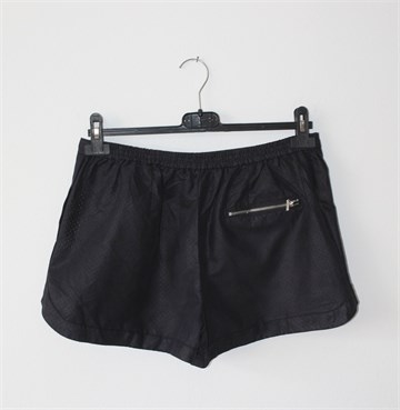 Zara Basic kratke hlače tamno plave boje (materijal djeluje kao imitacija kože), rupičasti uzorak na materijalu. Prednji bočni džepovi, stražnji ukrasni džepić sa cifom. Sa stražnje strane pasice je gumica pa je širina dosta prilagodljiva (vidjeti mjere).
