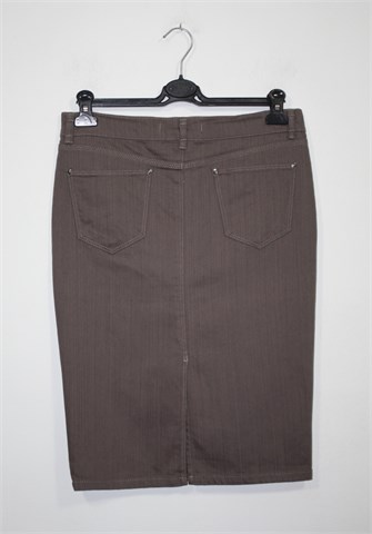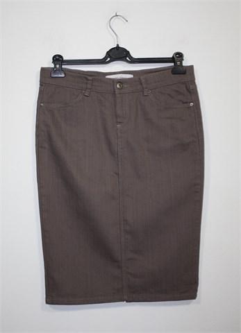 Zara Basic traper suknja sivo-smeđe boje. Prednji cif i kopčanje, pasica za remen. Prednji i stražnji klasični džepovi, mali stražnji rasporak. Blago rastezljiva.