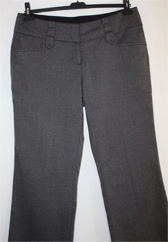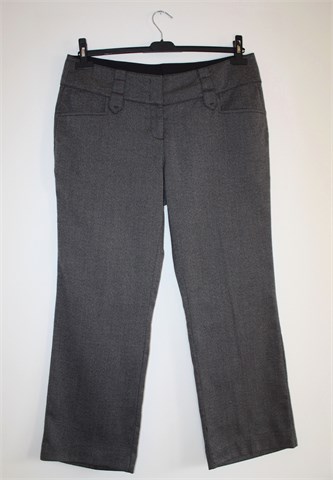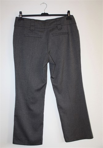 Zero hlače sive boje s uzorkom. Prednji cif i kopčanje, uska pasica za remen. Prednji bočni, stražnji ukrasni džepovi. Mekan i tanji štofasti materijal. Skraćene.