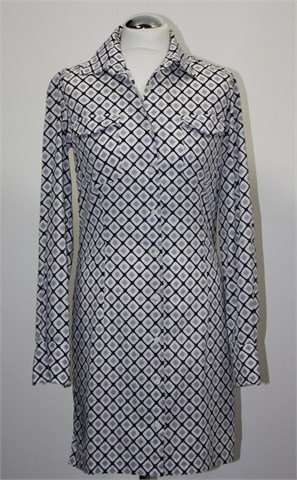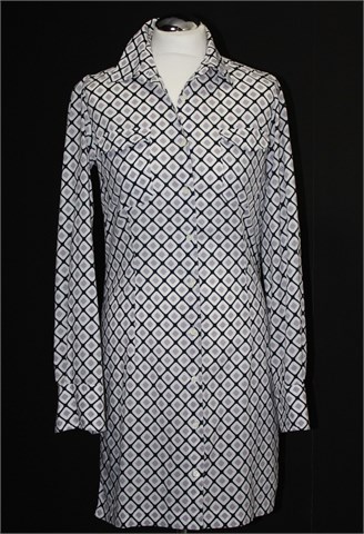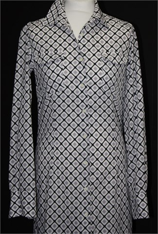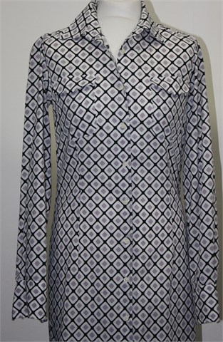 Dizajnerska 0039 Italy dugačka košulja/tunika crne boje sa bijelo-sivim printom (boje i uzorak printa vidljivi na slikama). Prednje kopčanje cijelom dužinom, mali džepići sa preklopom na prsima. Prednji i stražnji ušitci, strukirana. Tanji i lagan pamuk, mali bočni prorezi.