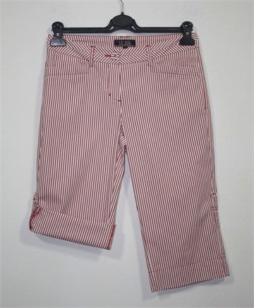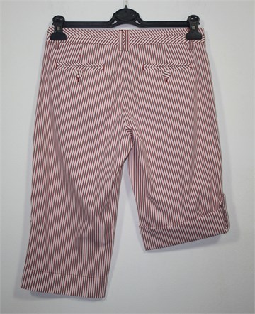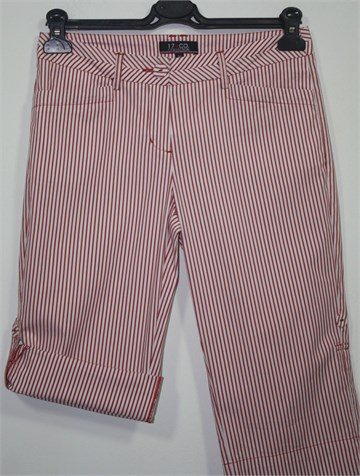 17&Co. poluduge hlače bijele boje sa crvenim prugama. Prednji cif i kopčanje, pasica za remen. Prednji kosi džepovi, stražnji sa gumbićem. Nogavice se mogu nositi i kao kraće - vidljivo na slici - (pomoću vanjskog gumbića na nogavici i vezice unutar nogavice), mali prorez na kraju svake nogavice. Tanji i lagan materijal, blago rastezljiv.