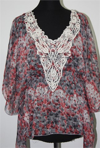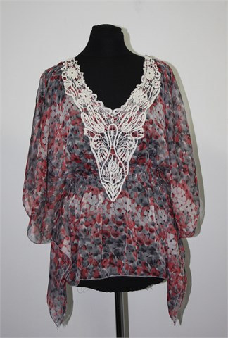 2U bluza/tunika sa širokim rukavićima, prošarani uzorak (boje i uzorci kao na slici). Sa prednje strane heklani detalji, u struku prošivena gumicama. Lagana i prozračna, prozirna. Asimetrične dužine (jedan rubić se malo odšio ali nije jako vidljivo).