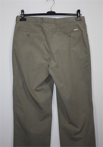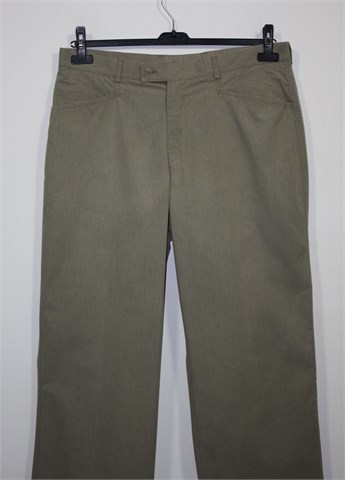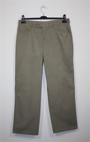 4 You hlače bež boje sa sitnim prugastim uzorkom. Prednji cif i kopčanje, pasica za remen. Prednji i stražnji džepovi (stražnji skriveni sa gumbom). Čvrst ali lagan materijal, nije rastezljiv.