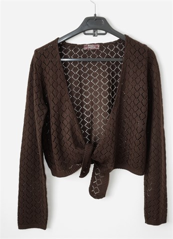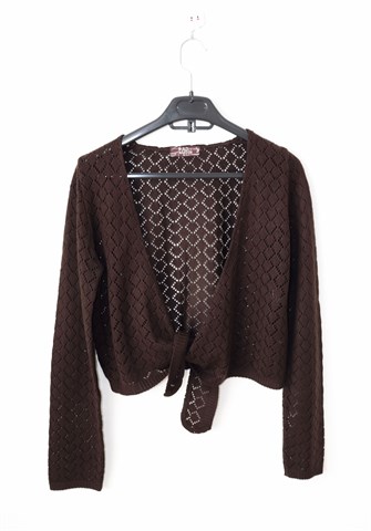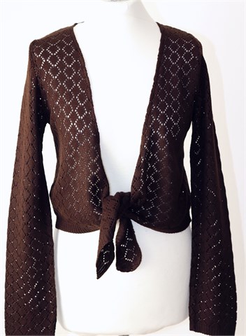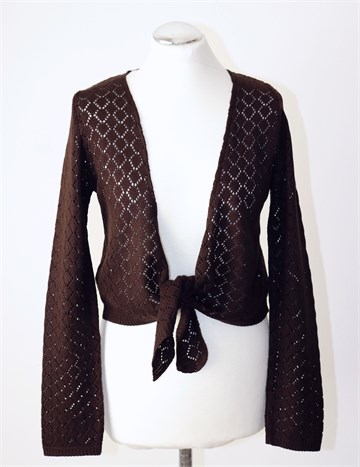 AD Basics rupičasta kraća vesta, tamno smeđe boje. Vezanje sa prednje strane. Tanje i lagano rupičasto pletivo, rastezljivo.
