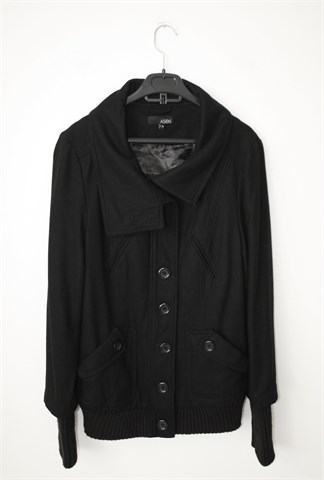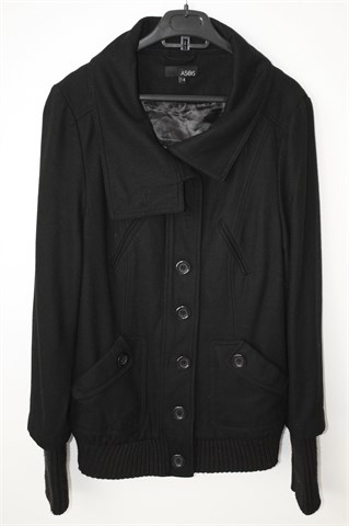 ASOS kaput crne boje, pasica i krajevi rukava pleteni materijal. Prednje kopčanje (jedan gumb se odšio), bočni džepovi i ukrasni džepovi na prsima. Podstavljen, nije rastezljiv.