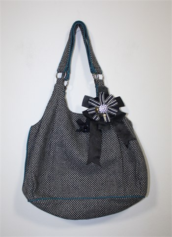 Accessorize torbica od tvida/štofa prošarano crno-bijele boje (uzorak), protkana sjajnim nitima. Zatvaranje sa magnetnim gumbom, unutra glavni pretinac i jedan bočni sa cifom. Sa vanjske strane našivene aplikacije (vidljivo na slici).
