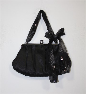 Accessorize malena torbica-novčanik (clutch) od satena crne boje. Kratka ruučkica od crnog tila, prošivena srebrnim koncem i aplicirana crnim šljokicama-ljuskicama.