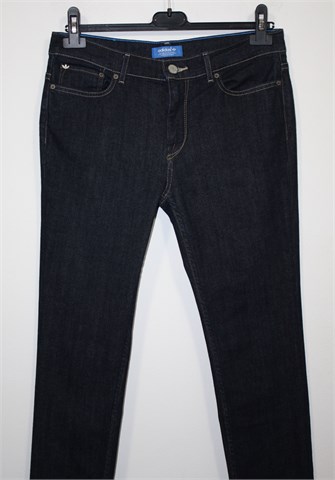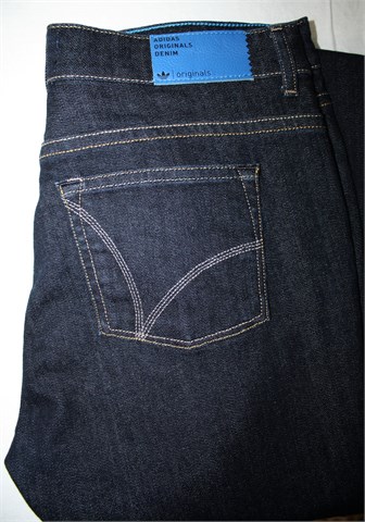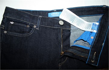 Adidas traper hlače (original, serijski brojevi na unutarnjoj etiketi), tamno plave boje. Prednji cif i kopčanje, pasica za remen. Prednji i stražnji klasični džepovi (na prednjem džepu našivena značkica adidas). Blago rastezljive.