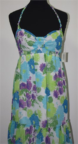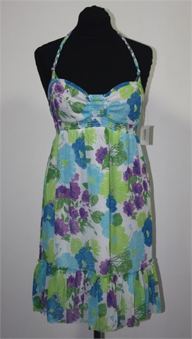 Aeropostale haljina bijele boje sa lijepim cvjetnim printom (boje i uzorak printa kao na slikama). Vezanje oko vrata sa pletenim trakama, leđa su otvorena. Ispod prsiju i na leđima haljina je prošivena sa gumicama pa je širina prilagodljiva (vidjeti mjere). Na dnu volančić, podstavljena.
