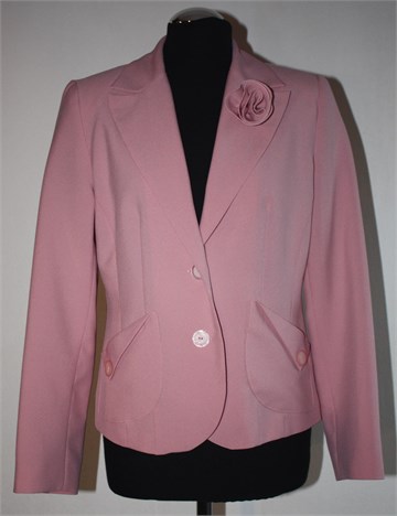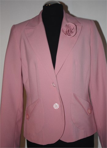 Aguzzo sako roze boje, blago strukiran (prednji i stražnji ušitci). Prednje kopčanje sa dva gumba, bočni džepovi sa ukrasnim gumbićem. Na reveru ukrasni cvjetić (trebalo bi ga malo učvrstiti koncem), jastučići u ramenima. Cijeli podstavljen.