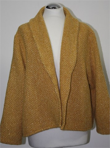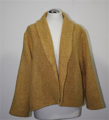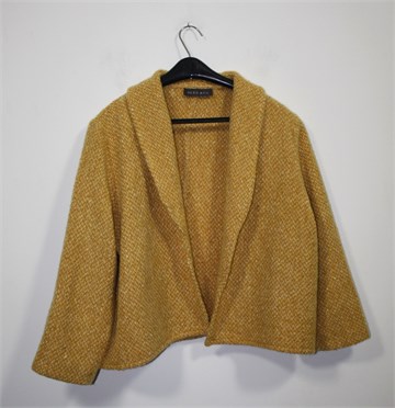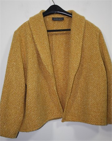 Alex & Co. pletena jakna/vesta prošarano tamnije bež-smeđe-narančaste boje (mjestimični špricani uzorak u svijetlim bojama), rukavi su poludugi. Nema kopčanje (mogu se po želji zašiti kopčice). Debelo i toplo mucasto pletivo.