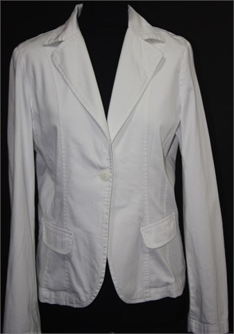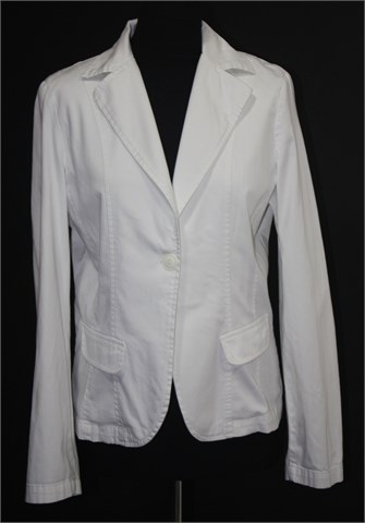 Amadeus jakna/sako bijele boje. Prednje kopčanje na jedan gumb, prednji ukrasni džepovi sa preklopom. Blago rastezljiv materijal.