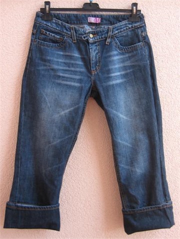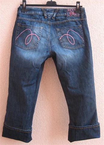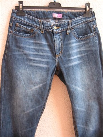 Poluduge traper hlače, mjestimično blago ispranog izgleda. Prednji i stražnji klasični džepovi (stražnji džepovi i etiketa ukrašeni prošivima od rozog konca). Prednji cif i kopčanje na dva gumba, pasica za remen.