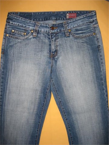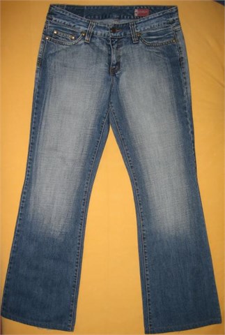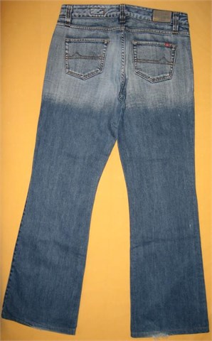 Traper hlače, nižeg struka. Ispranog izgleda, iscufane na dnu nogavica (takve su kupljene). Džepovi naprijed i otraga. Nisu rastezljive. Malo nošene.
