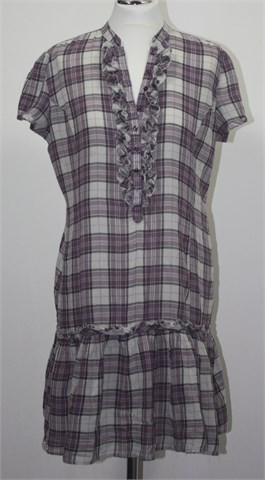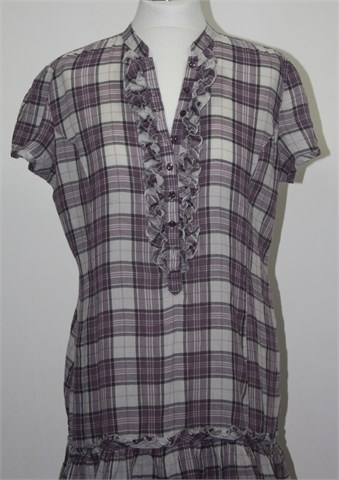 Amadeus tunika sa kratkim rukavima, prljavo bijelo/sive boje sa ljubičastim (kariranim) uzorkom na tkanini. Prednje kopčanje, ukrasni volančići. Tanak, lagan i mekan pamuk.